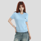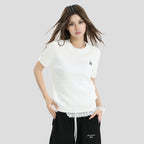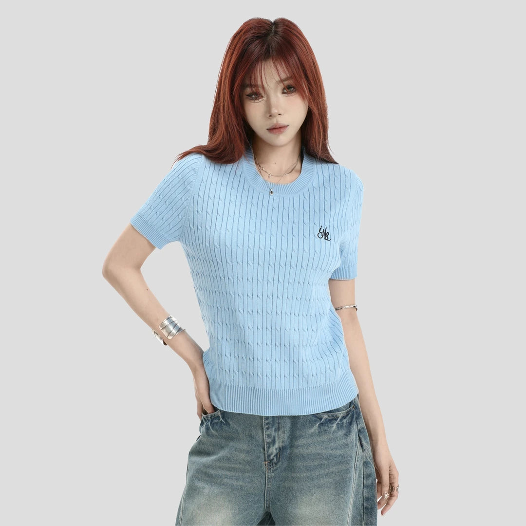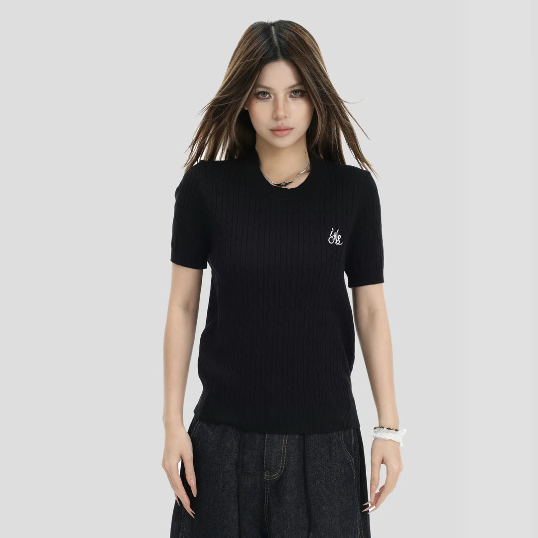 the INSstudio short-sleeved twisted knit T-shirt use of high-quality soft 200 grams of superfinefiber cool feeling yarn woven fabric, The top is comfortable, the pattern is firm, the outline is clear. The wholegarment weighs about 0.4 pounds (200 grams) and the pattern is suitable. it uses an environmentally friendly dyeingpracess that does not lose.color, shrinks and does not easily catch the.bal, high-density embroidery process, and theembroidered logo has a distinctive sense of stereo. Enhances the stereotic feel and artistic appeal of the clothingitself. The right-shouldered sleeve desiqn is rich in detail, the five-tone color palette provides more choice formatching, and knit short sleeves as an out-of-date style provides more possibilities for matching. it is a suitable andversatile round-neckshort-sleeved t-shirt for hot and sweet girls.